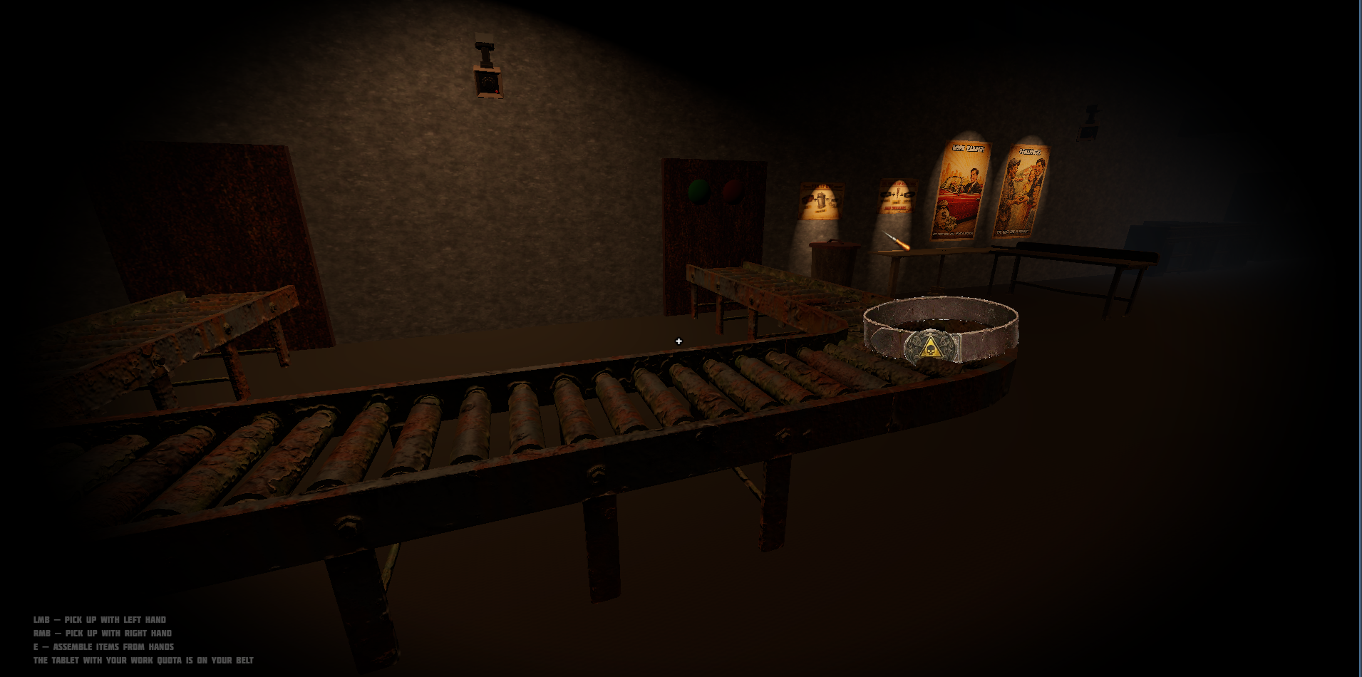 Your job is simple: stand at the conveyor, assemble belts, then send them away.